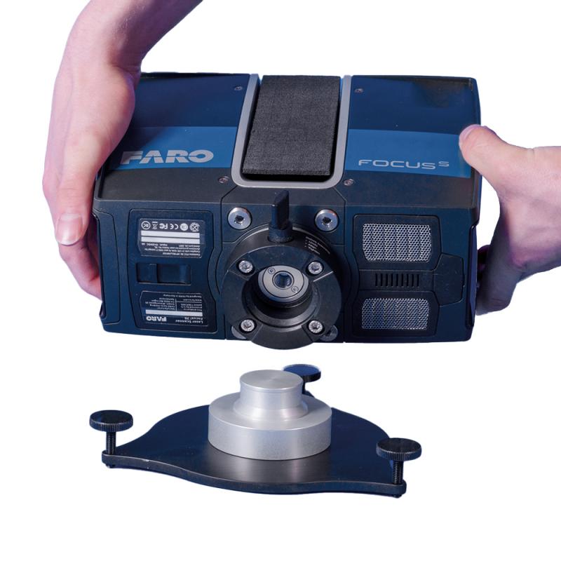 Ground-level tripod designed for FARO Focus scanners with ATS quick release system. Provides safe and stable scanning at low heights (e.g., under piping or installations). Dimensions 18×18×5.5 cm (Ø22 cm), weight 450 g. Scanner height on tripod ~28.5 cm. Equipped with 3 leveling screws for uneven ground. Material: anodized aluminum. Delivery: tripod with ATS/FARO quick release adapter.