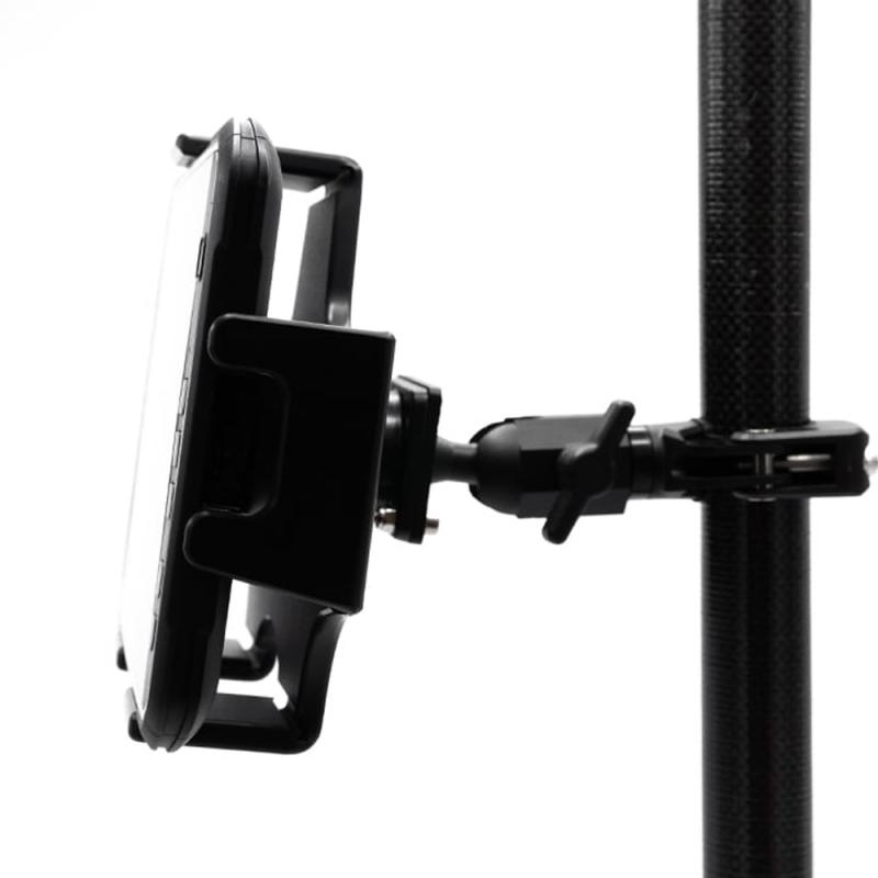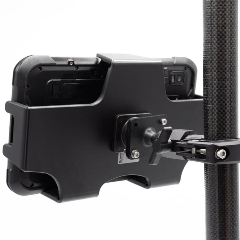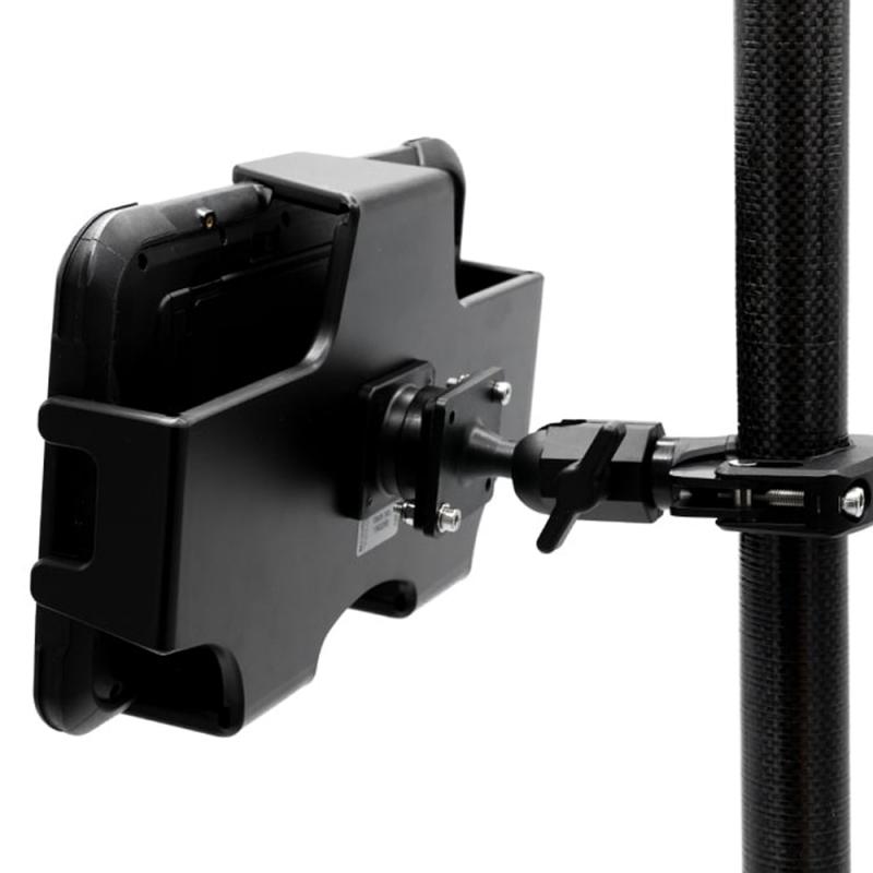 A pole mount with a short-arm bracket for the Algiz RT8 tablet. The ball joint allows you to adjust the angle as needed; the clamp fits most pole diameters. Includes AMPS-hole pattern for secure mounting.