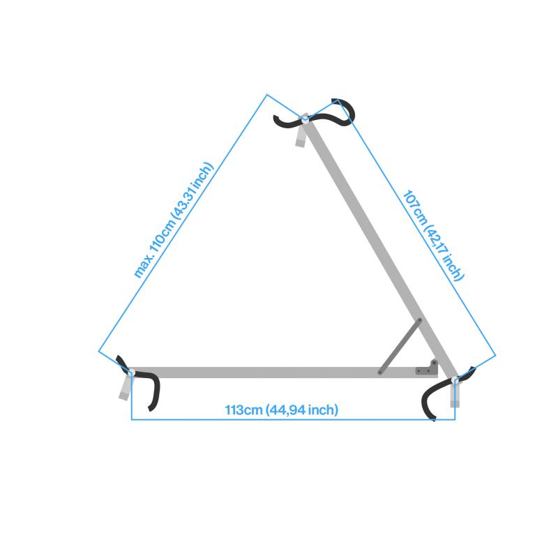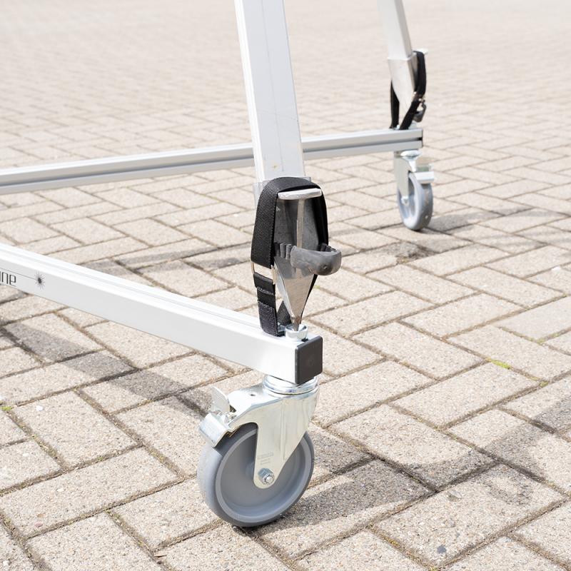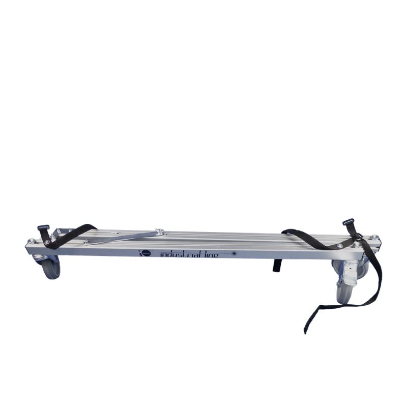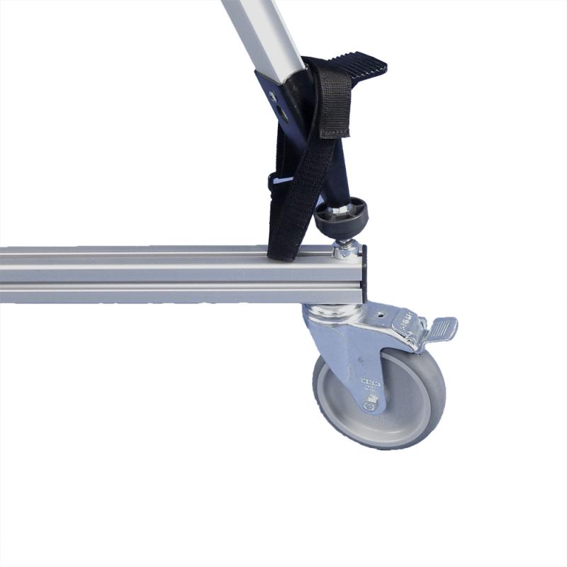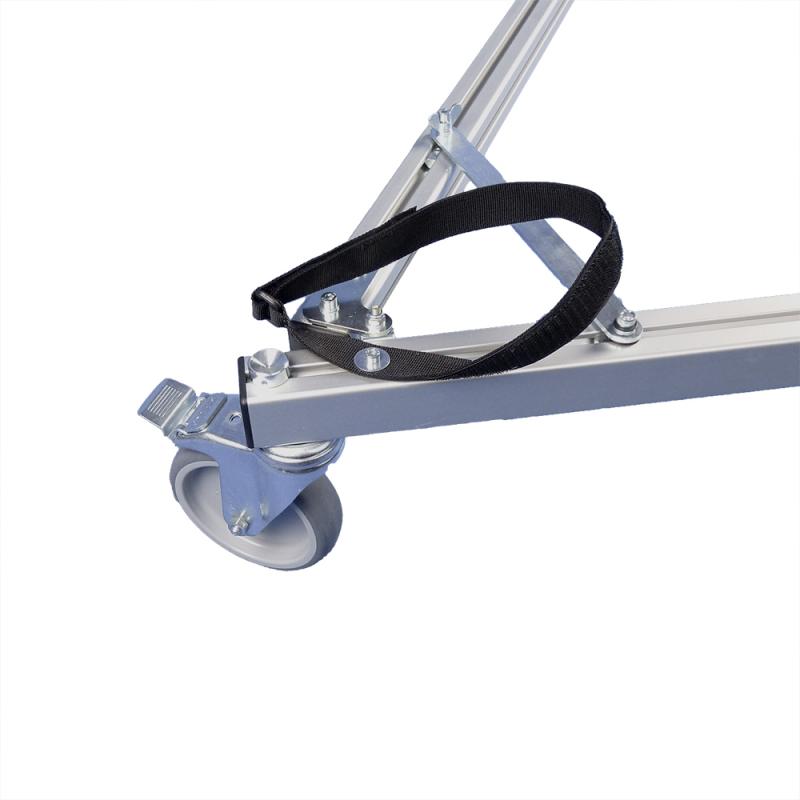 Foldable aluminium tripod dolly for transporting laser scanner tripods. Two foldable legs and open third side ensure easy access to the scanner, ideal for overhead scanning. Supports loads up to 60 kg, robust triangular frame, and lockable 125 mm wheels for safe scanning. Compact pack size (1180 × 105 × 210 mm) for easy transport. Universal compatibility with carbon and aluminium tripods.