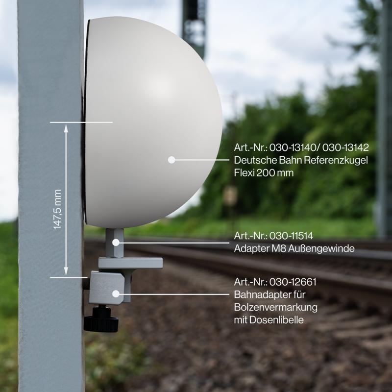 Set of 3 robust 200 mm reference spheres for Deutsche Bahn fixed point signaling, supplied in a plastic case with inlay. Weatherproof cut surface (2.5 cm offset from center) ensures optimal scanner detection. Compatible with Deutsche Bahn rail adapter (030-12661) and intermediate adapters. Can be combined with Flexi and Basic full spheres. Compatible with FARO Focus (all series), Trimble X7/TX5/TX8, Leica RTC360, BLK360, ScanStation P-series, Z+F IMAGER, GeoSLAM, Surphaser, Artec Ray, Teledyne Polaris, Riegl (on request). Delivery content: 3 spheres + 3 magnets + 1 plastic case with inlay.