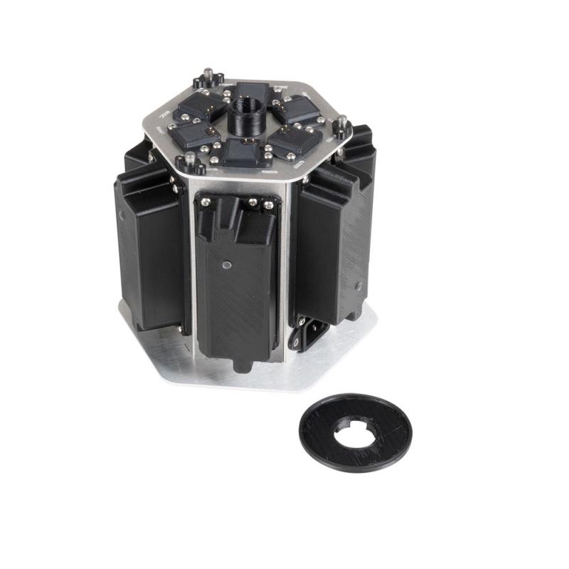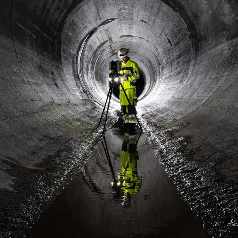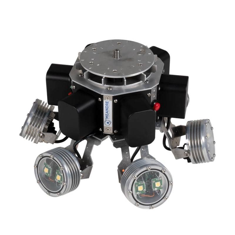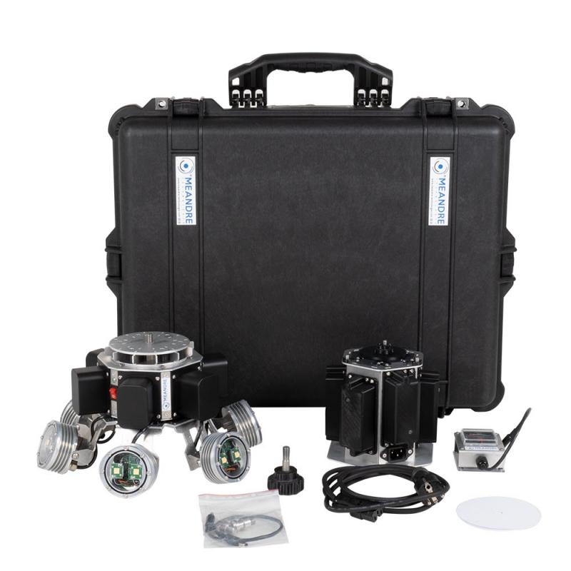 Professional 360° lighting for Leica RTC360 laser scanner. Provides uniform 3000 lm per head illumination for high-quality scans in tunnels, caves, and dark environments. Includes Li-ion battery (453.6 Wh), charger, and protective case.