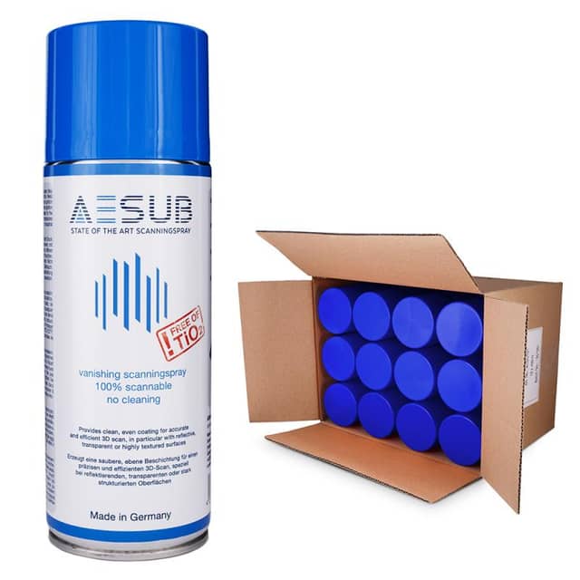 AESUB Blue is a professional anti-reflective spray for 3D scanning that eliminates reflections and transparency. Its key feature is complete self-evaporation within a few hours without leaving residue or requiring cleaning. This package includes 12 spray cans, ideal for industrial projects and large teams.