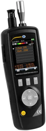 The PCE Instruments PCO-2 is a handheld particle counter for monitoring air quality. It measures particle sizes of 0.3, 0.5, 1.0, 2.5, 5.0, and 10 µm, and mass concentrations of PM2.5 and PM10. Compact, portable design, suitable for cleanrooms, HVAC systems, and environmental monitoring.