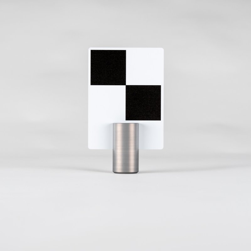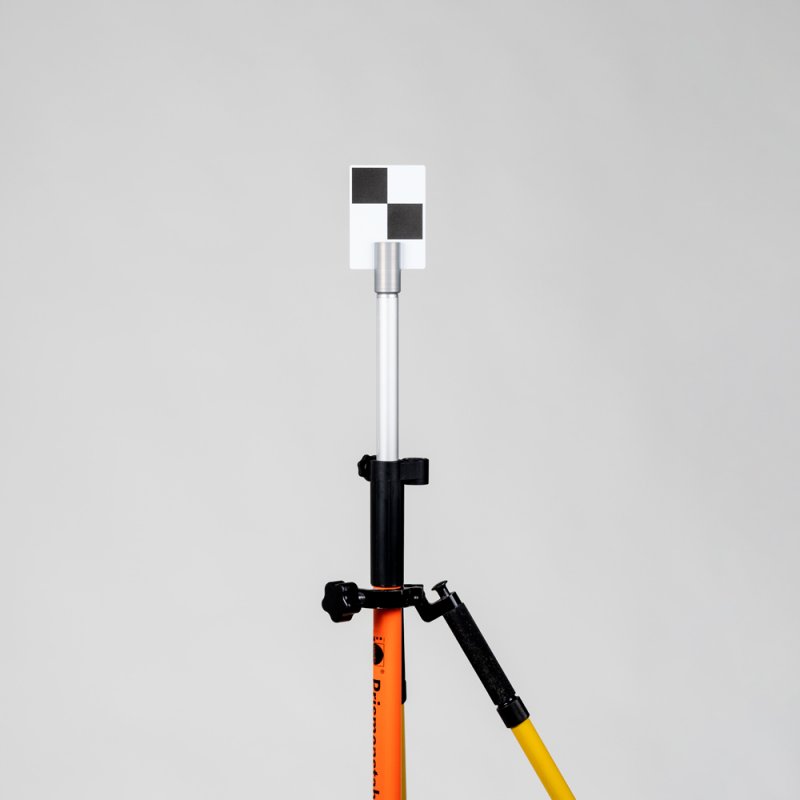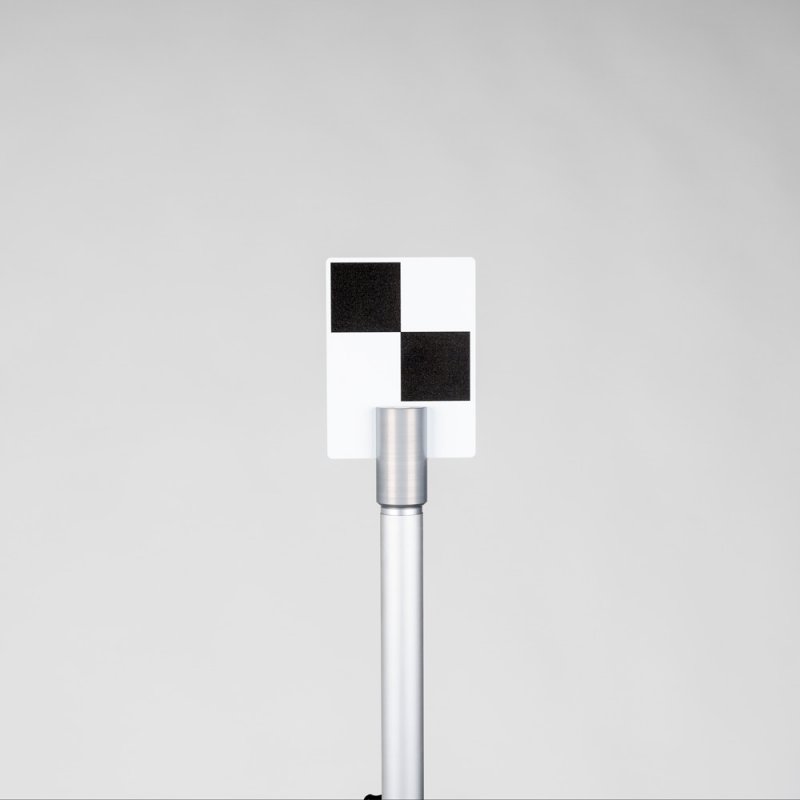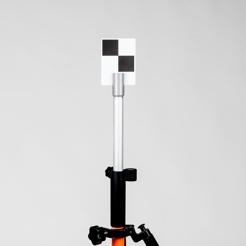 Torsion-resistant aluminum composite checkerboard target with 5/8" female thread. Size: 116×86 mm, checkerboard 80×80 mm, weight 105 g. Features integrated circular level and tilt axis at 100 mm. Weather resistant, flat surface for precise results. Applications: georeferencing scan projects (Trimble X7, TX5, TX8), flexible setup on prism poles or tripods. Range up to 40 m. Compatible with Trimble, FARO, Leica scanners. Delivery: 1 checkerboard target with 5/8" thread.