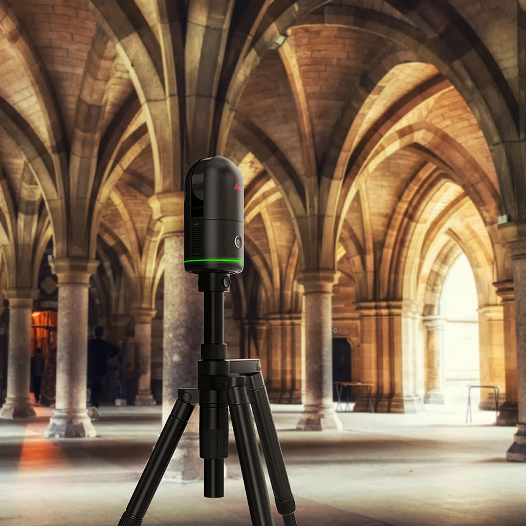 The integrated four-camera HDR imaging system captures high-dynamic-range spherical imagery, enabling colorized point clouds and immersive digital environments.