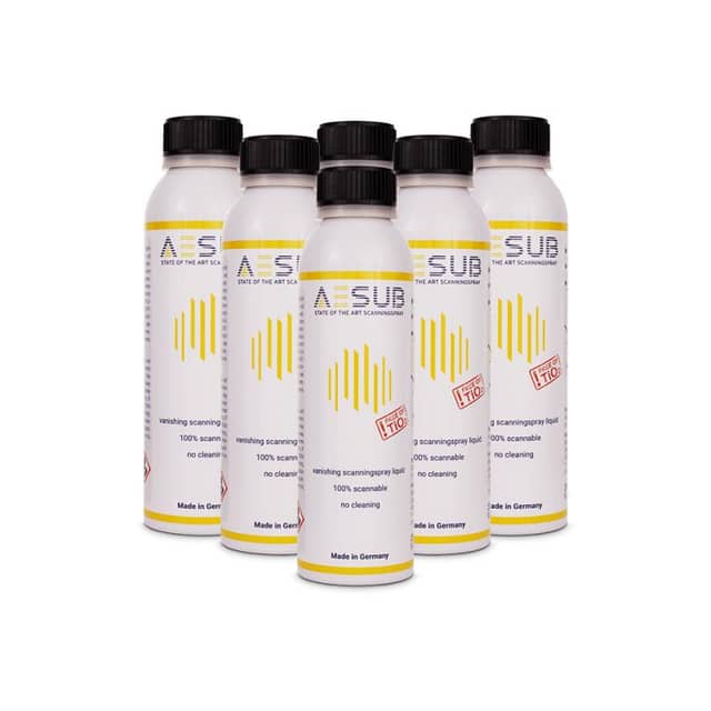 AESUB Yellow is an advanced anti-reflective spray for 3D scanning that provides a bright and long-lasting matte coating. It eliminates reflections and transparency on glossy and transparent surfaces. This package includes 6 spray bottles, perfect for professional use.