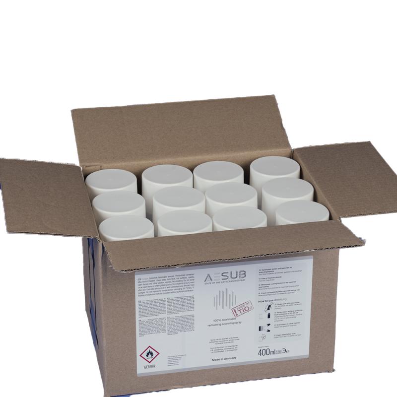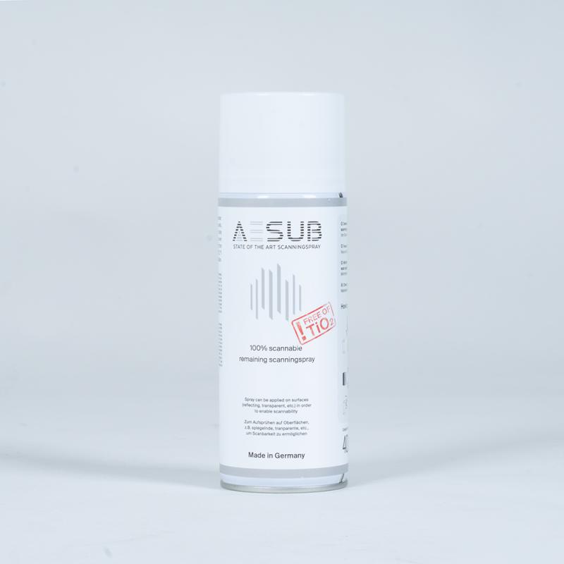 AESUB White is a long-lasting matting spray for 3D scanning that does not evaporate. The coating remains until it is washed off with water or a remover. It is ideal for industrial and scientific applications requiring stable, durable coverage. This set includes 12 spray cans.
