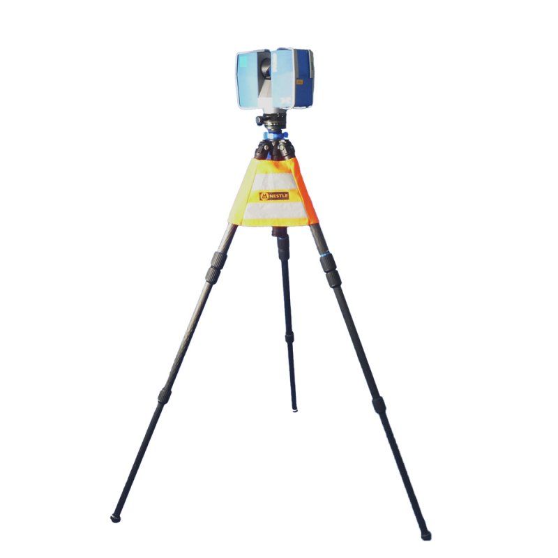 Tripod warning kilt optimizes visibility of laser scanners mounted on tripods. Bright orange color with reflective strips improves safety in tunnels and low-light conditions. Easy attachment via hook-and-loop fastener. Height 20 cm, weight 40 g. Compatible with all tripods. Delivery: 1 warning kilt.