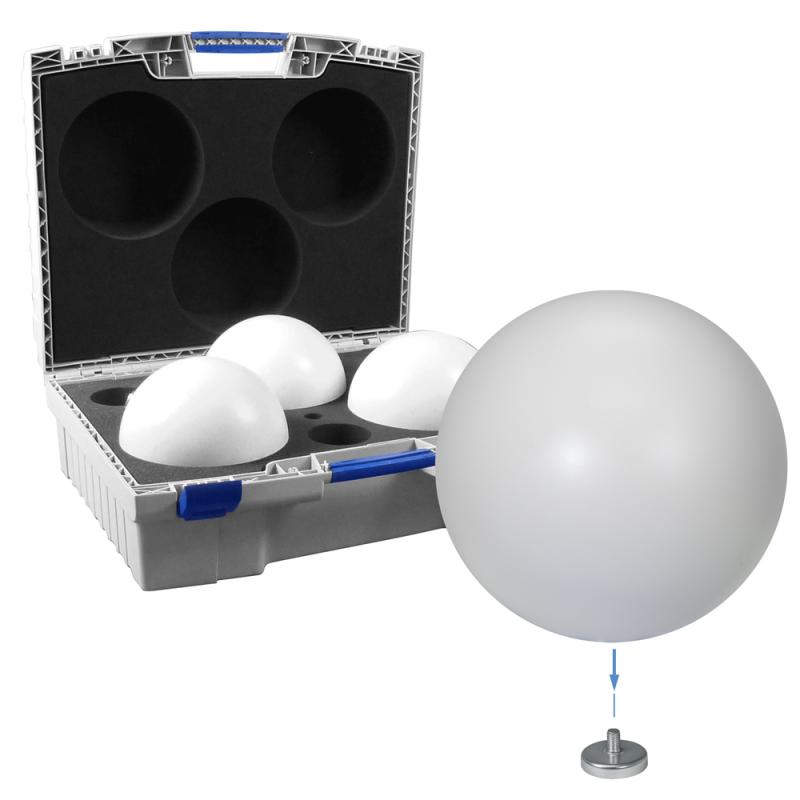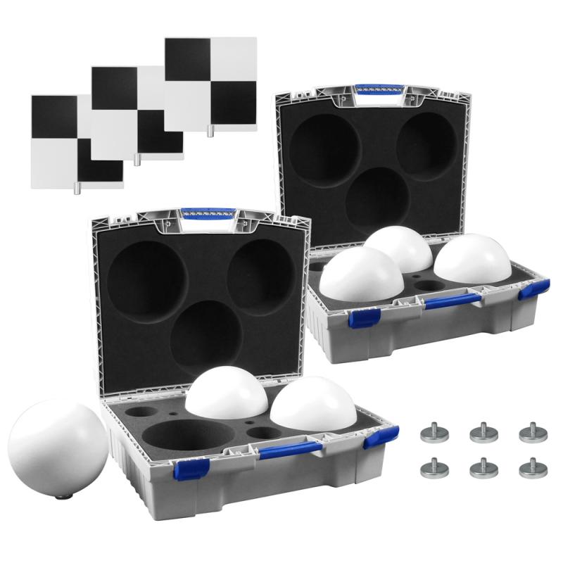 Outdoor long-range target kit for laser scanning. Includes 2 XXL FLEXI reference sphere sets (3 spheres each, Ø200 mm) and 3 large target plates (40×40 cm) with 5/8" connection. Ideal for long-distance control points.