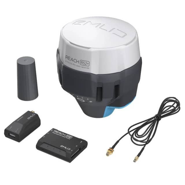 The Reach M2 UAV-RTK Kit+ by EMLID includes the Reach M2 as Rover and the Reach RS2+ as Base station, multi-band GNSS antenna, LoRa radios, cables, and carrying case. Provides centimetre-level positioning: RTK up to 60 km, PPK up to 100 km. Rugged IP67 housing, operating temperature from −20 °C to +65 °C.