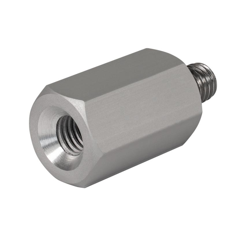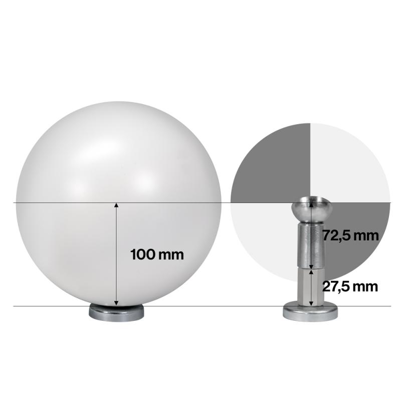 Aluminum height adapter for aligning round checkerboard targets (4.5"/6") with reference spheres (Ø145 mm). Ensures identical center height. Thread: M8 male (10 mm) + M8 female. Adapter length without thread: 27.5 mm. Made in Germany.