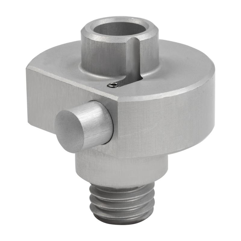Quick-release aluminum adapter for converting Leica stud bolts to 5/8" male thread. Height: 5 cm, Ø4.5 cm. One-hand operation with push button. Applications: positive centering on tribrachs, placing reference points on fixed ground marks, and mounting spheres or targets in natural surroundings. Compatibility: Leica stud bolts, prism reference spheres (Ø100 mm), checkerboard targets (fixed & pivoted). Delivery: 1 adapter with 5/8" male thread.