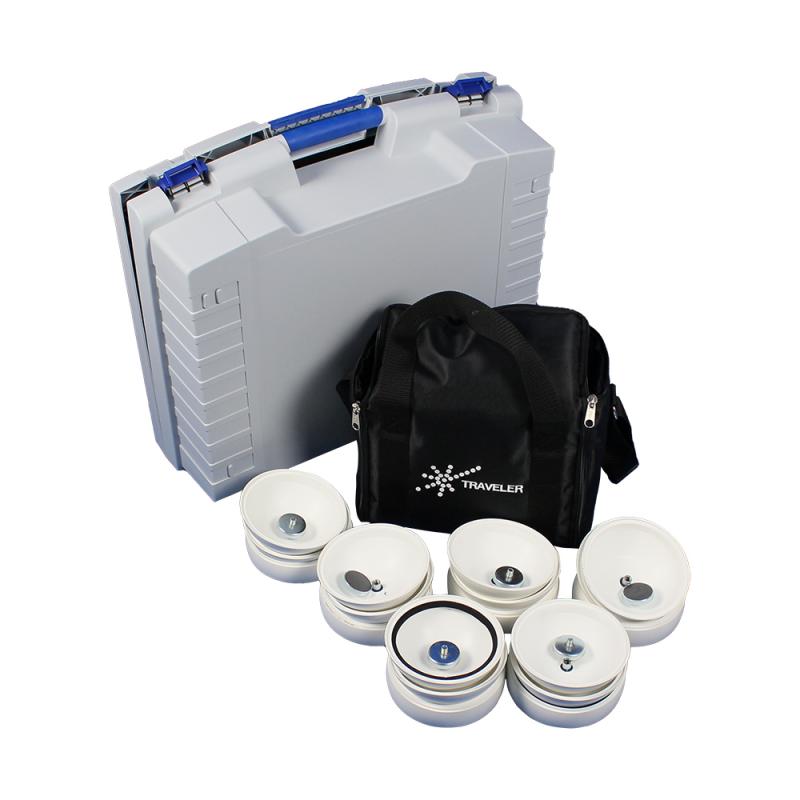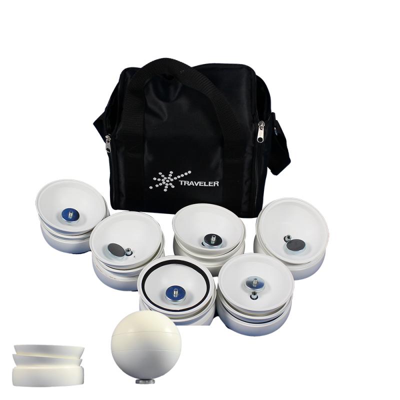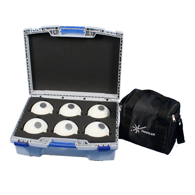 Innovative divisible 145 mm reference sphere set for laser scanning. The Traveler spheres are built from 3 precisely fitting parts, easy to assemble/disassemble. Compact bag transport saves 70% volume and 50% weight compared to a plastic case. Set of 6 spheres supplied with case (575×470×205 mm) and travel bag (320×190×270 mm). Applications: architecture, monument preservation, factory planning, mining, transport, energy, steel industry, forensics. Compatible with FARO Focus, Trimble X7/TX5/TX8, Leica RTC360, BLK360, ScanStation P-series, Z+F IMAGER, GeoSLAM, Surphaser, Artec Ray, Teledyne Polaris, Riegl (on request).
