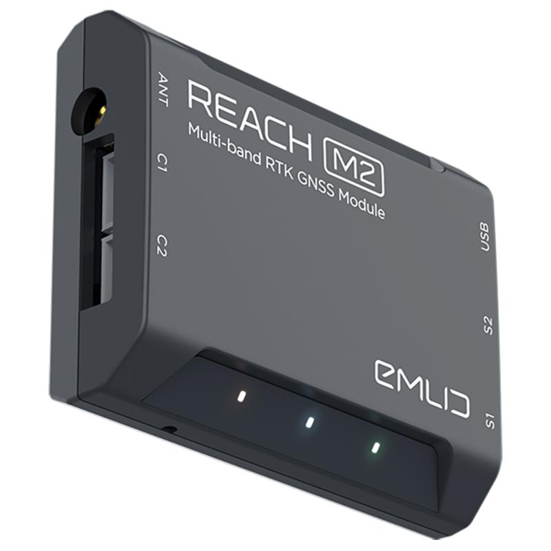The Reach M2 is a multi-band RTK GNSS module with 20 g weight, designed for UAV mapping and photogrammetry. It supports ~184 GNSS channels, GPS/QZSS L1C/A + L2C, GLONASS L1/L2, BeiDou, Galileo. Offers RTK up to 60 km and PPK up to 100 km, fast fix, 16 GB internal storage, control via app or web interface.
