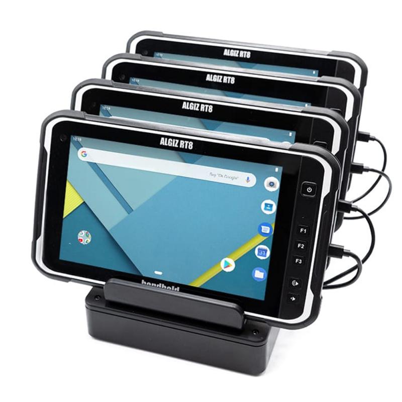 The Four-Slot Charging Station (P/N: HHTC-01) for Handheld tablets allows you to charge up to four devices simultaneously (compatible with Algiz RT8 / RT10). Equipped with USB-C charging and the full 0-100 % charge takes about 5 hours.