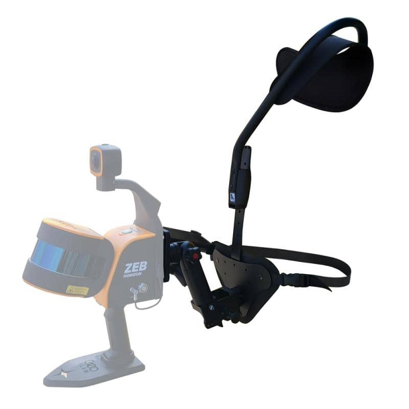 Ergonomic shoulder support for GeoSLAM ZEB Horizon scanner. Adjustable height, aluminum tube construction, quick mount and release. Includes phone holder, initialization base, and carrying bag. Frees hands and balances weight for long scanning sessions.