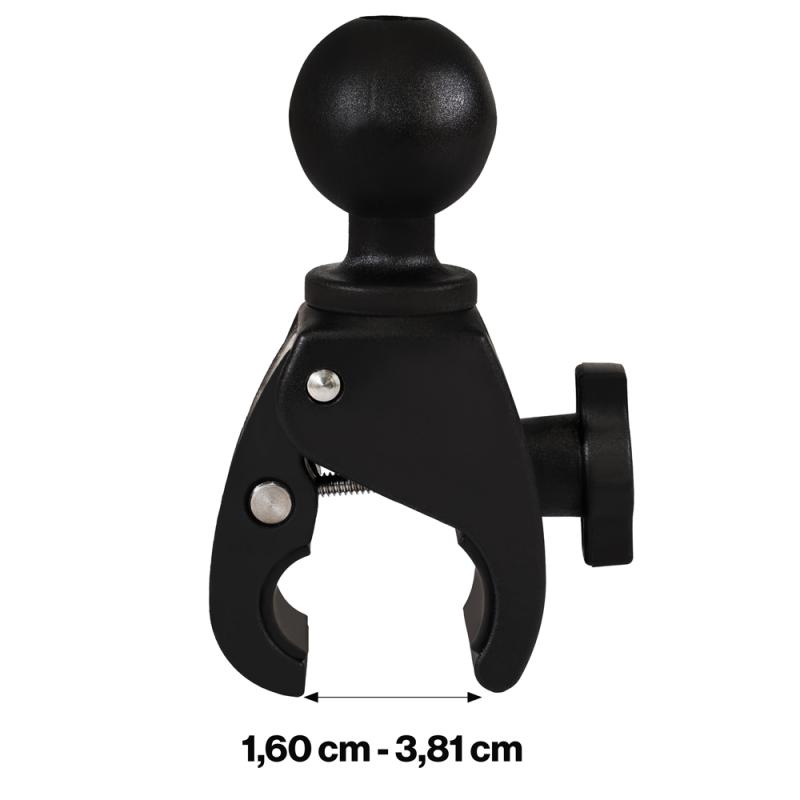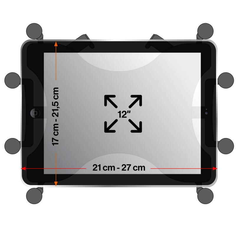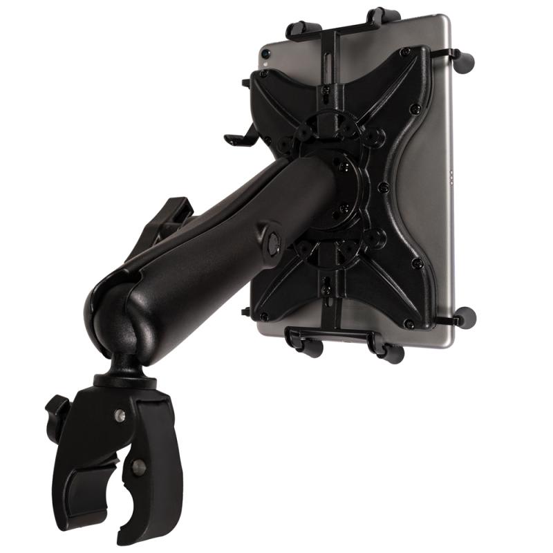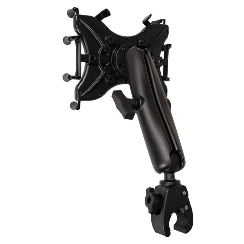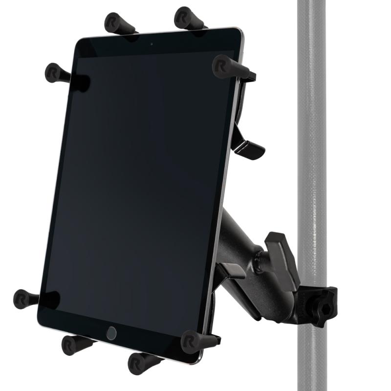 The Ram Mounts universal mount for up to 12-inch tablets: spring-loaded X-grip holder, long connecting arm with ball joint, plastic retaining clip. Designed to attach securely to GPS poles with diameters from 1.60-3.81 cm. Tablet size compatibility: width 21-27 cm, height 17-21.5 cm.