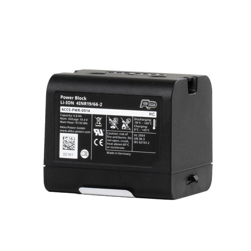 Original FARO lithium-ion Power Block battery (14.4V, 6.8Ah, 97.92Wh) for Focus S/M, Premium, Core, and ScanLocalizer. Provides up to 4.5 hours of operation. Compatible only with firmware 6.7+.