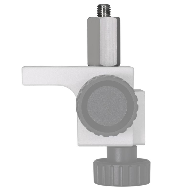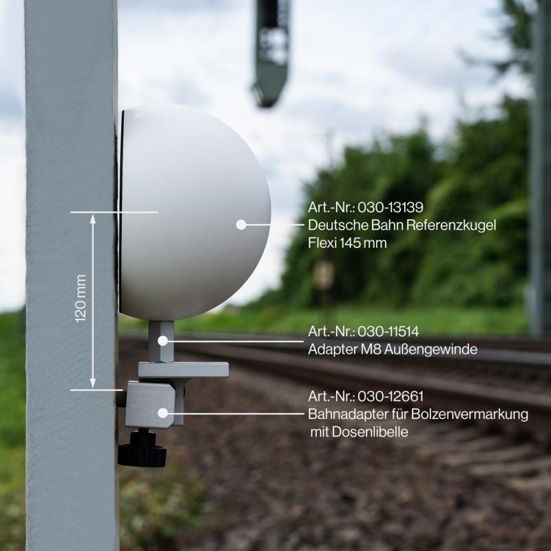 Aluminum adapter with M8 male threads on both sides (45 × 17 × 17 mm, 27 g). Used for attaching reference spheres (Ø145 mm) to wall studs or other M8 female threads. Enables mounting on railroad adapters and ensures stable positioning of spheres at 100 mm from wall.