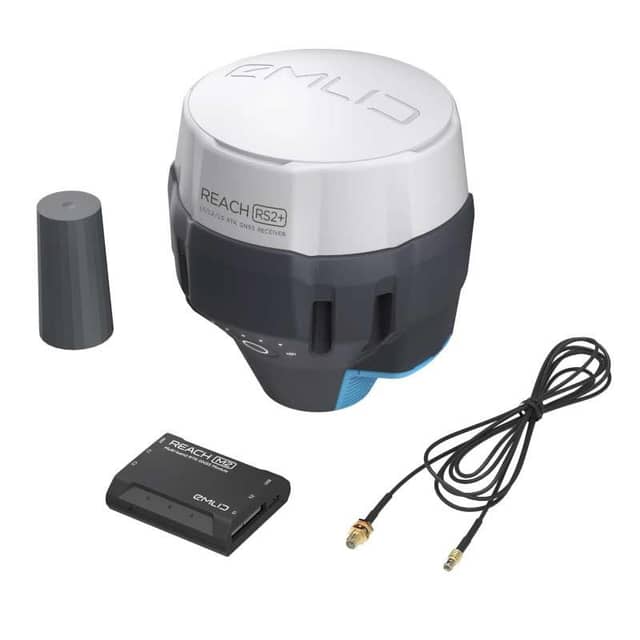 The Reach M2 UAV Mapping Kit without a Hot-Shoe adapter is a precision aerial mapping bundle. It uses the Reach RS2+ as the Base and Reach M2 as Rover, includes a GNSS antenna, LoRa antenna, cables, carrying case. Supports RTK up to 60 km, PPK up to 100 km, rated IP67, NTRIP modes, static precision ~4 mm + 0.5 ppm horizontally.