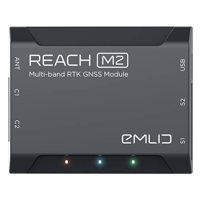 The Reach M2 is a multi-band RTK GNSS module with 20 g weight, designed for UAV mapping and photogrammetry. It supports ~184 GNSS channels, GPS/QZSS L1C/A + L2C, GLONASS L1/L2, BeiDou, Galileo. Offers RTK up to 60 km and PPK up to 100 km, fast fix, 16 GB internal storage, control via app or web interface.